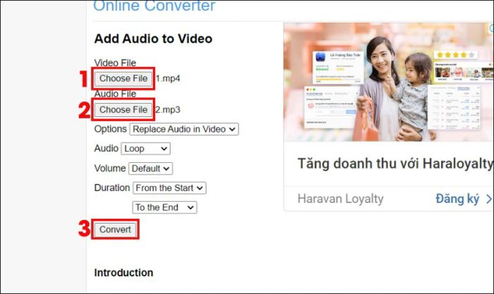 Bước 4: Tại hai mục Video file và Audio file, bạn nhấn vào Choose File để tải lên video và file âm thanh. Sau đó, nhấn Convert để bắt đầu quá trình chèn âm thanh vào video.
