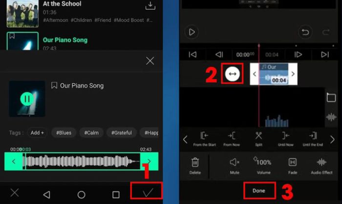 Bước 3: Tiếp theo, bạn nhấn vào dấu tích. Chọn đoạn nhạc bạn muốn ghép bằng cách điều chỉnh file nhạc, sau đó nhấn Done để hoàn thành.