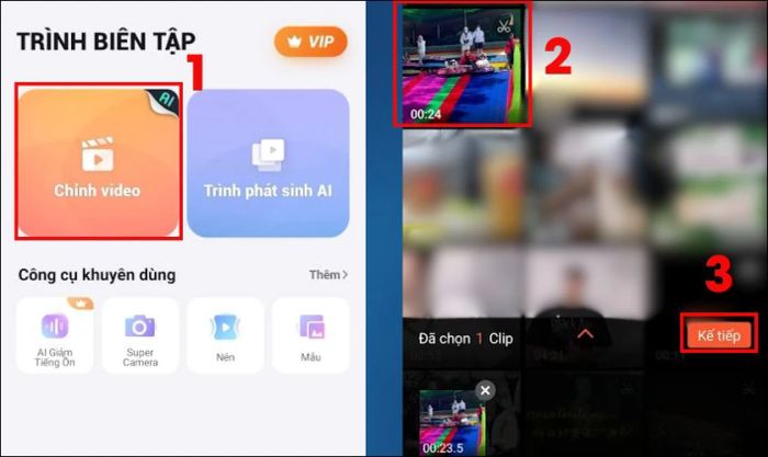 Bước 1: Mở ứng dụng VideoShow và chọn Chỉnh video. Tiếp theo, chọn video bạn muốn chỉnh sửa và nhấn Kế tiếp để tiếp tục.