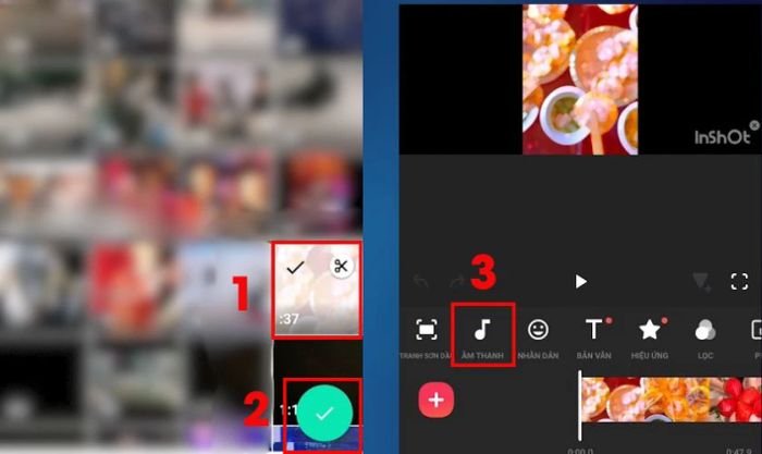 Bước 2: Chọn video bạn muốn thêm âm thanh, sau đó nhấn vào dấu tích. Tiếp theo, nhấn vào mục ÂM THANH để tiếp tục.