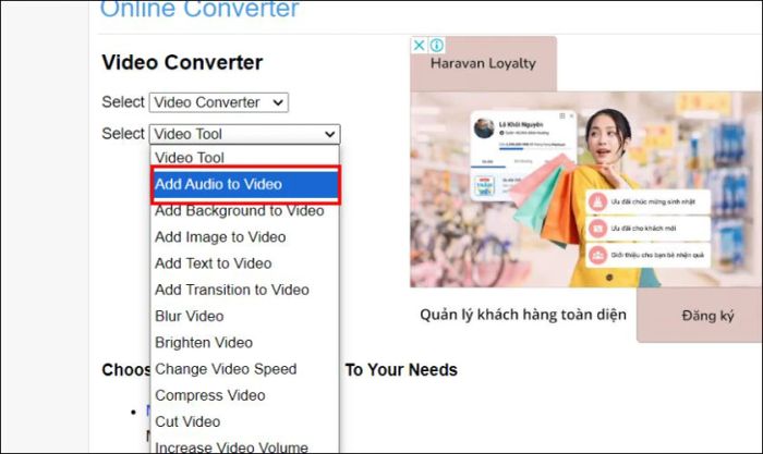 Add Audio to Video là một nền tảng trực tuyến nổi tiếng với nhiều công cụ chỉnh sửa video đa dạng. Một trong những tính năng nổi bật là khả năng thêm nhạc hoặc âm thanh vào video. Để sử dụng trang web này, bạn chỉ cần làm theo hướng dẫn chi tiết dưới đây.