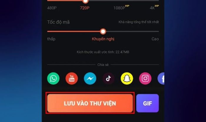 Bước 4: Cuối cùng, bạn nhấn vào LƯU VÀO THƯ VIỆN để lưu video hoặc chọn các nền tảng mạng xã hội để chia sẻ.