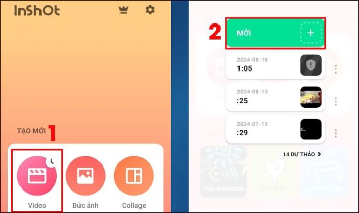 Bước 1: Mở ứng dụng Inshot và chọn mục Video, sau đó nhấn vào Mới để thêm video bạn muốn chỉnh sửa.