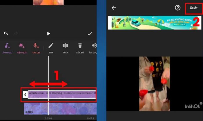 Bước 4: Kéo thanh điều chỉnh để thay đổi âm lượng hoặc cắt đoạn âm thanh, sau đó nhấn dấu tích. Cuối cùng, nhấn Xuất để lưu video hoặc chia sẻ lên các nền tảng khác.