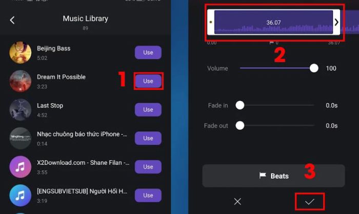Bước 5: Chọn đoạn nhạc bạn muốn sử dụng, nhấn dấu tích, điều chỉnh âm lượng và nhấn lại dấu tích để hoàn tất.