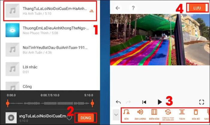 Bước 3: Chọn âm thanh bạn muốn sử dụng, nhấn Dùng. Sau đó, chỉnh sửa đoạn âm thanh theo ý muốn và nhấn Lưu để hoàn thành.