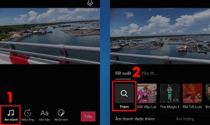 Bước 3: Bạn nhấn vào mục Âm thanh để thêm nhạc hoặc âm thanh vào video. Bạn có thể chọn từ danh sách nhạc TikTok gợi ý hoặc nhấn Thêm để tải lên âm thanh khác.