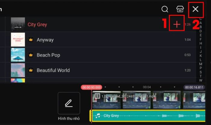 Bước 5: Chọn âm thanh bạn muốn sử dụng, nhấn vào dấu + để thêm vào video, sau đó nhấn dấu x để xác nhận.