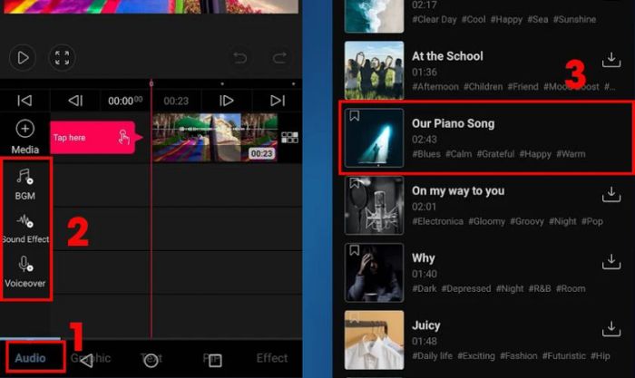 Bước 2: Bạn chọn mục Audio, sau đó chọn BGM, Sound Effect hoặc Voice để thêm âm thanh vào video. Tiếp theo, chọn bài nhạc bạn muốn sử dụng.