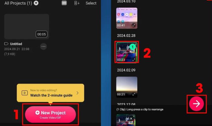 VLLO nổi bật với khả năng xuất video chất lượng cao lên đến 4K. Bạn có thể thoải mái chỉnh sửa video, thêm nhạc, chèn văn bản với ứng dụng này. Để thêm nhạc vào video trên VLLO, hãy làm theo các bước sau: Bước 1: Mở ứng dụng, nhấn vào New Project, chọn video cần tải lên và nhấn vào mũi tên để tiếp tục.