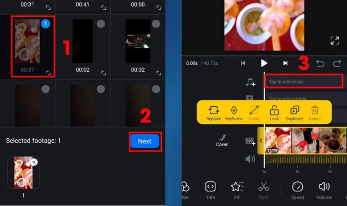 Bước 2: Chọn video bạn muốn chỉnh sửa, nhấn Next, sau đó chọn Tap to add music để thêm âm thanh.