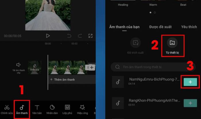 Bước 2: Bạn nhấn vào mục Âm thanh, sau đó chọn Từ thiết bị. Tiếp theo, chọn file MP3 bạn muốn thêm vào video và nhấn dấu cộng để xác nhận.