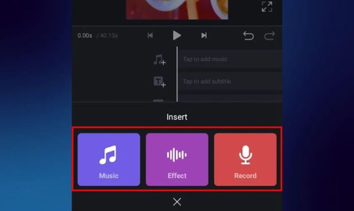 Bước 3: Bạn có thể chọn Music hoặc Effect để sử dụng các âm thanh có sẵn trong ứng dụng VN Video Editor. Ngoài ra, bạn cũng có thể chọn Record để tự ghi âm và thêm vào video.