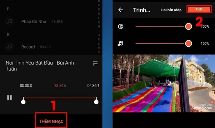 Bước 3: Sau khi chọn được âm thanh, bạn nhấn vào Thêm nhạc. Tiếp theo, chỉnh sửa âm thanh theo ý muốn và nhấn Xuất để hoàn thành.