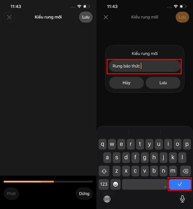 Bước 3: Quay lại màn hình cài đặt báo thức, chọn mục Cảm ứng > Lựa chọn kiểu rung mong muốn. Nếu muốn tạo kiểu riêng, bạn có thể chọn Tạo kiểu rung mới > Chạm vào màn hình để tạo nhịp rung theo sở thích. Nhấn Lưu và đặt tên cho kiểu rung để dễ dàng nhận diện sau này.