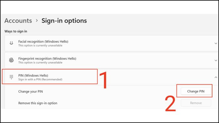 Bước 4: Chọn PIN (Windows Hello) > Change PIN để thay đổi mật khẩu.