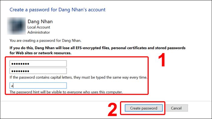 Bước 5: Nhập mật khẩu mới, xác nhận lại mật khẩu và gợi ý mật khẩu > Chọn Create password để hoàn tất.