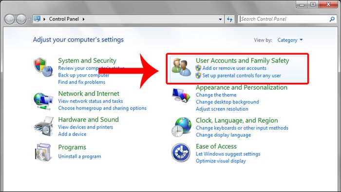 Bước 2: Chọn User Accounts and Family Safety để tiếp tục.