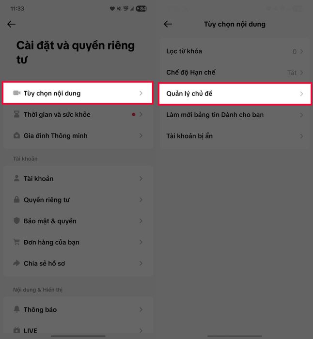 Bước 2: Trong giao diện Cài đặt, chọn mục Tùy chọn nội dung > Sau đó nhấn vào phần Quản lý chủ đề để xem các tùy chọn liên quan đến nguồn nội dung.