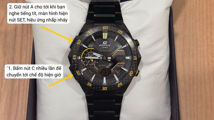 - Thao tác 1: Ấn giữ phím A để kích hoạt chế độ hiệu chỉnh thời gian. Giữ nguyên cho đến khi nghe tiếng bíp và màn hình hiển thị nút Set