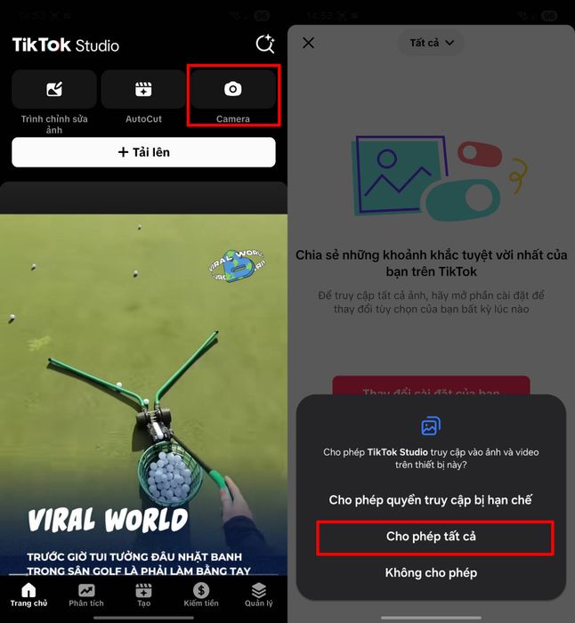 Bước 3: Sau khi đăng nhập thành công, chọn mục Chụp ảnh > Cấp quyền cho TikTok Studio để truy cập vào máy ảnh và thư viện ảnh của bạn, giúp ứng dụng có thể chụp và lưu ảnh về điện thoại.