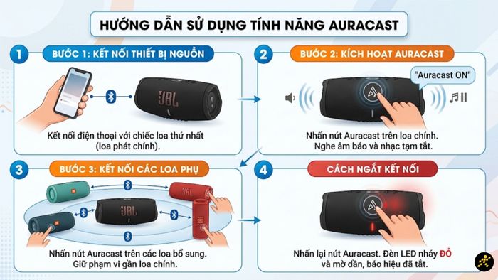 Cách ngắt kết nối: Nhấn lại nút Auracast. Đèn LED sẽ nháy ĐỎ và mờ dần, báo hiệu tính năng đã được tắt.
