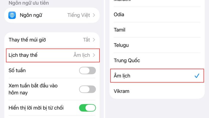 Vào Cài đặt > Lịch > Lịch thay thế > Chọn “Lịch âm”.