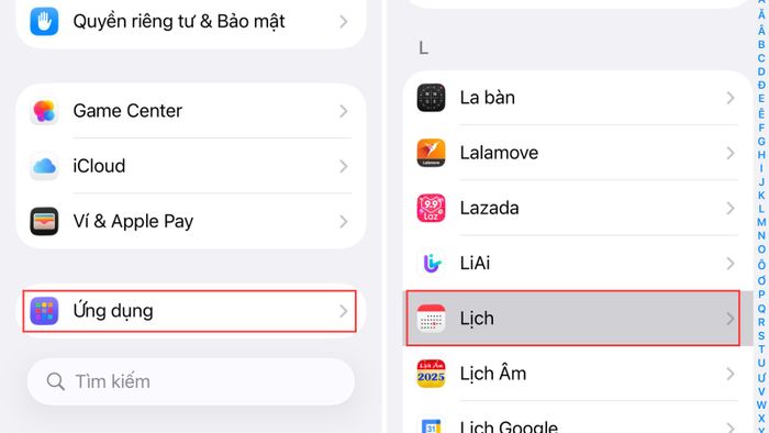 Bước 1: Mở ứng dụng Cài đặt (Settings) trên iPhone/iPad. Cuộn xuống dưới cùng và chọn mục Ứng dụng, sau đó chọn ứng dụng Lịch (Calendar).