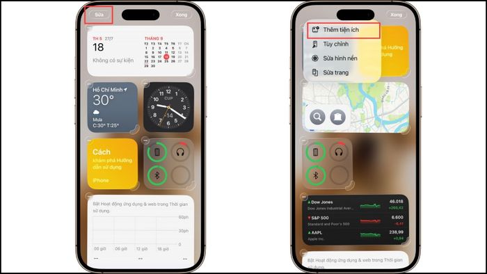 Bước 1: Tại màn hình chính, giữ ngón tay trên màn hình khoảng 2-3 giây cho đến khi các ứng dụng bắt đầu rung. Chọn Sửa ở góc trái trên cùng > Thêm tiện ích.