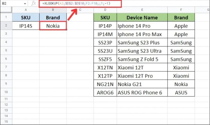 Ví dụ: Bạn cần trả về giá trị của Brand tương ứng với SKU trong ô A2. Điều kiện là tìm kiếm từ mục cuối lên mục đầu tiên. Nếu không tìm thấy kết quả chính xác, hàm sẽ trả về giá trị lớn hơn gần nhất.
