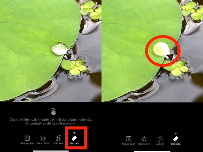 Bước thứ hai: Tìm và chọn biểu tượng Clean Up (biểu tượng cục tẩy) > Dùng ngón tay vẽ khoanh vùng hoặc tô lên phần vật thể/người muốn loại bỏ, hệ thống AI sẽ tự động thực hiện thao tác xóa.