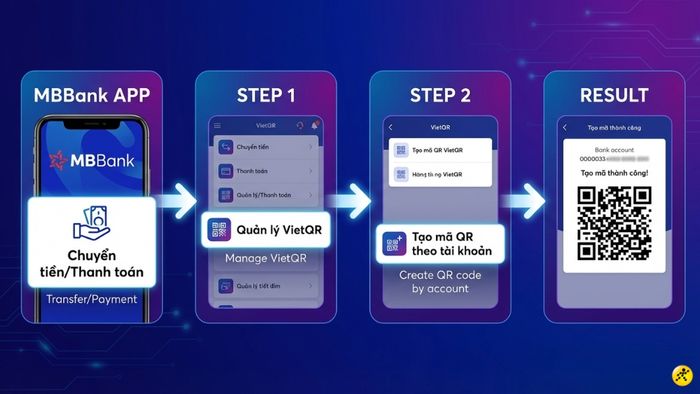 MBBank: Chọn "Chuyển tiền/Thanh toán" -> "Quản lý VietQR" -> "Tạo QR theo tài khoản".