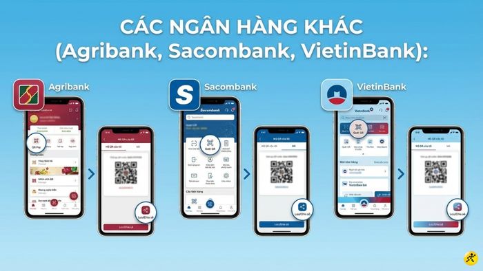 Ngân hàng khác (Agribank, Sacombank, VietinBank): Tìm tính năng QR Pay/Quét mã QR -> Chọn "Mã QR của tôi/My QR" -> Lưu/Chia sẻ.