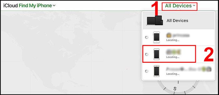 Bước 2: Chọn Find iPhone > Nhấn mũi tên xổ xuống tại mục All Devices > Chọn tên thiết bị của bạn.