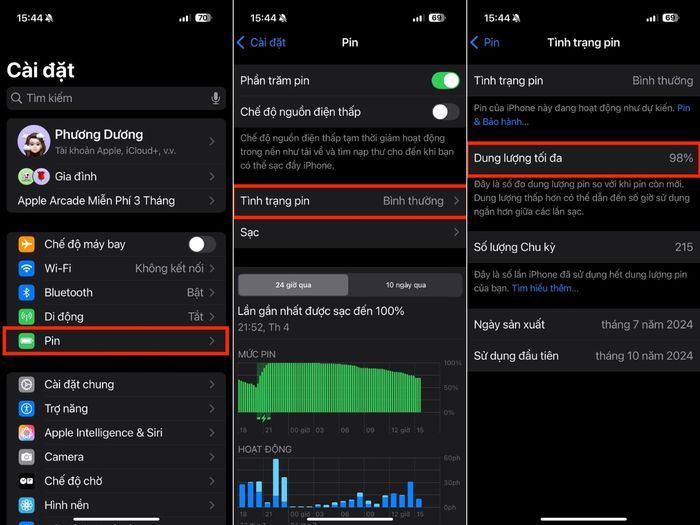 Các bước thực hiện: Cài đặt > Pin > Sức khỏe pin > Dung lượng tối đa