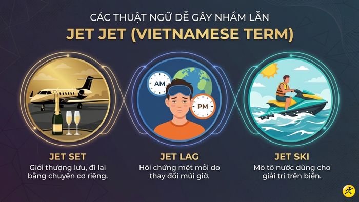 Khi dùng từ Jet jet, bạn nên chú ý để tránh nhầm với một số thuật ngữ tiếng Anh chuẩn có cách viết hoặc cách đọc tương tự: