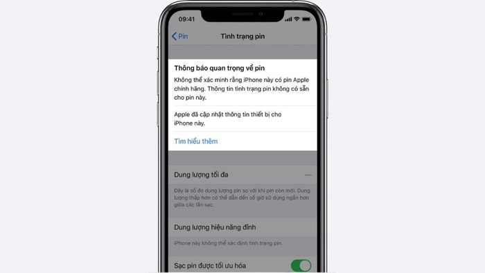 Thông báo hệ thống: Không thể xác nhận iPhone này sử dụng pin Apple chính hãng. Các thông tin về tình trạng pin không khả dụng với loại pin này.