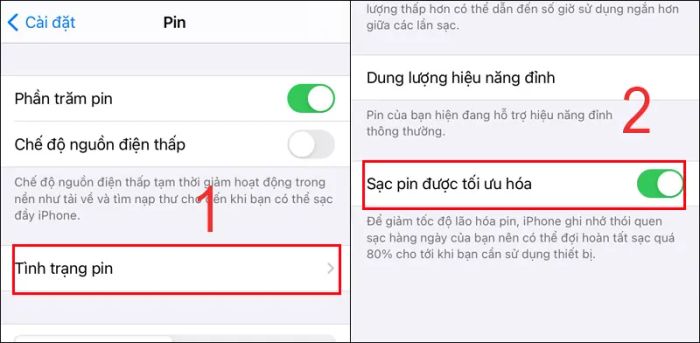 - Kích hoạt chức năng Tối ưu hóa sạc pin trong mục Cài đặt > Pin > Tình trạng pin để làm chậm quá trình lão hóa pin.