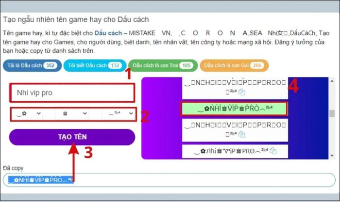Bước 2: Nhập tên bằng kí tự thông thường từ bàn phím và chọn 3 kí tự đặc biệt muốn thêm vào. Sau đó nhấn vào Tạo tên.