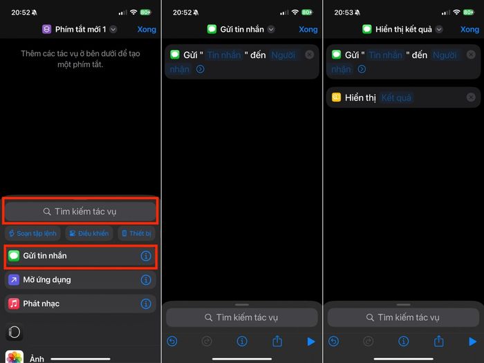 Bước 2: Nhấn vào mục Tìm kiếm thao tác > Nhập hành động mong muốn, chẳng hạn như Tạo báo thức hoặc Nhắn tin > Lựa chọn thao tác phù hợp.