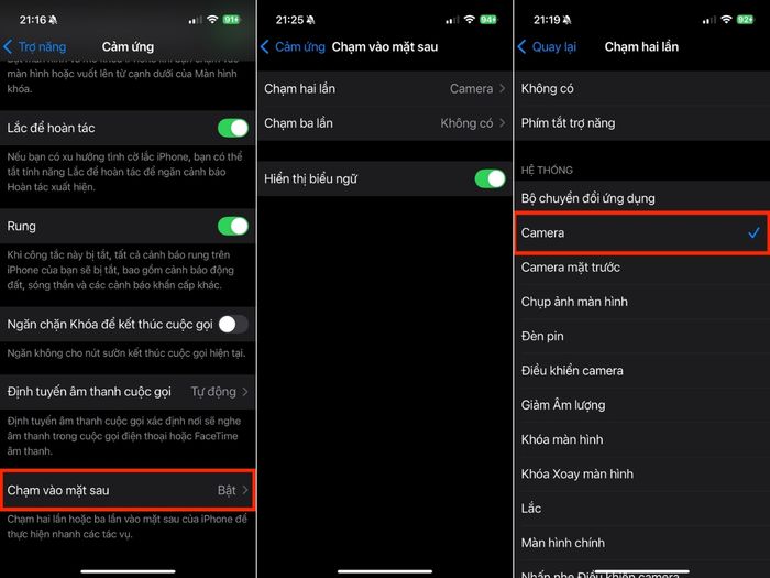 Bước 2: Bấm vào mục Chạm mặt sau > Lựa chọn giữa nhấn đúp hoặc nhấn ba lần để liên kết với phím tắt ưa thích.