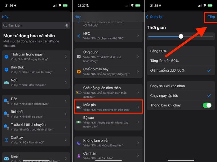 Bước 2: Tại giao diện Tự động hóa > Lựa chọn tình huống cần thiết lập > Tùy chỉnh thông số theo nhu cầu > Nhấn Tiếp tục.