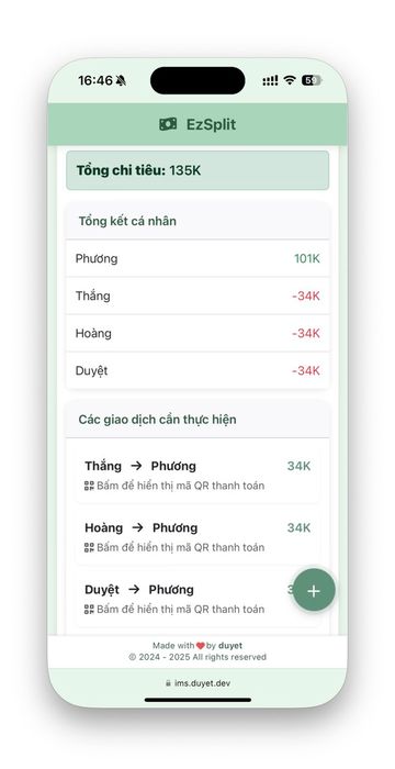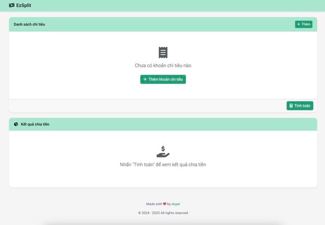 Các giao dịch sẽ hiển thị ai trả tiền cho ai và số tiền tương ứng. Giao diện trang web phải đơn giản, tinh tế, hiện đại, với màu xanh lá pastel làm chủ đạo, font Roboto, sử dụng HTML/CSS/JS và các thư viện cần thiết để tối ưu trang web. Tên trang web sẽ là EzSplit. Trang web cần xử lý các lỗi và trường hợp ngoại lệ nếu có. Cuối trang là footer 'Made with ♥️ by duyet' và copyright tác giả. Trang web cần tối ưu cho mobile vì sẽ chủ yếu sử dụng trên điện thoại."