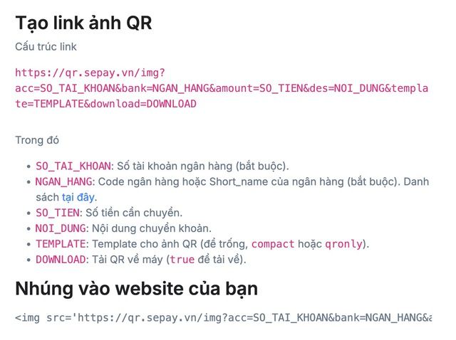 Mã QR sẽ được tạo ra dưới dạng ảnh thông qua endpoint sau đây: https://qr.sepay.vn/img?acc=[số tài khoản]&bank=VPB&amount=[số tiền]&des=[nội dung chuyển khoản]&template=compact&download=false (truy cập vào endpoint này sẽ trả về ảnh QR dựa trên truy vấn đằng sau endpoint)