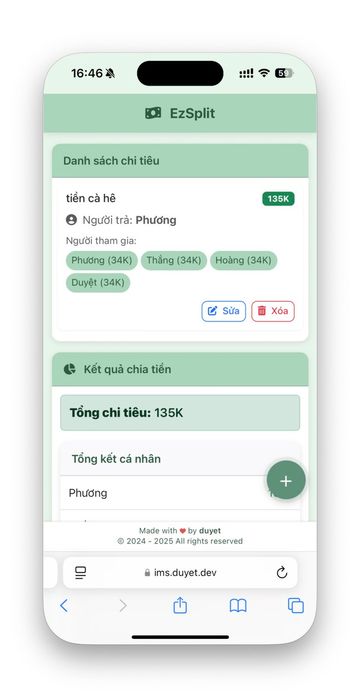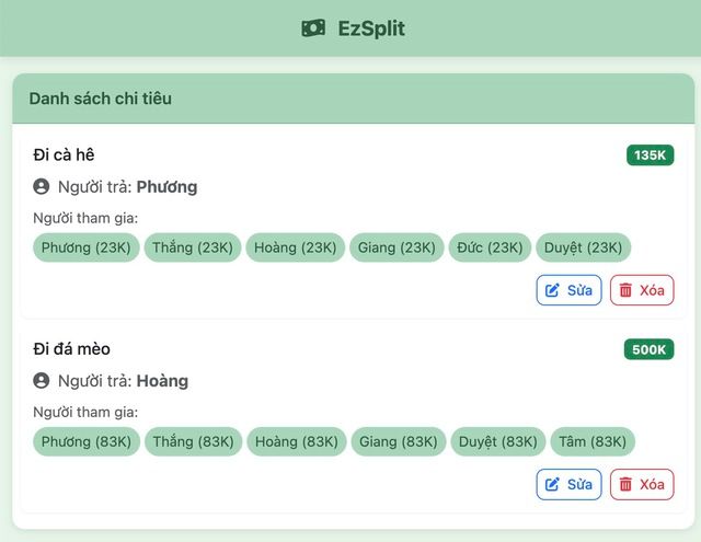 Sau khi thêm chi tiêu, danh sách chi tiêu sẽ hiện ra như thế này, mỗi mục chi tiêu sẽ có tùy chọn chỉnh sửa hoặc xóa, và sau mỗi thay đổi, trang web tự động tính toán lại số tiền nợ giữa các người tham gia