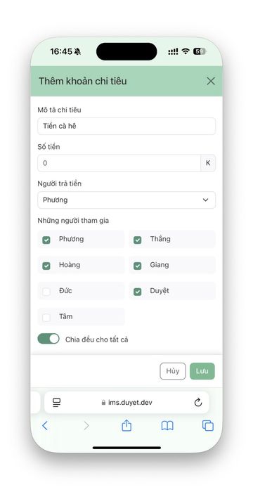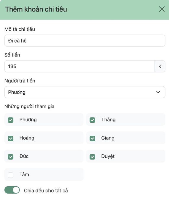 Form thêm chi tiêu có các trường bắt buộc như tên chi tiêu, số tiền (tôi dùng đơn vị K thay VNĐ để tránh phải nhập số 0 quá nhiều lần), người trả, danh sách những người tham gia và toggle switch chia đều cho tất cả