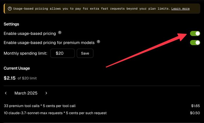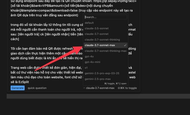 Tôi sử dụng model claude-3.7-sonnet MAX để xử lý prompt này. Đây là model trả phí theo từng request, giá 0,05 USD/lần, yêu cầu bật Usage-based pricing trong phần cài đặt của Cursor. Gõ Cmd + K để mở hộp thoại prompt khởi tạo.