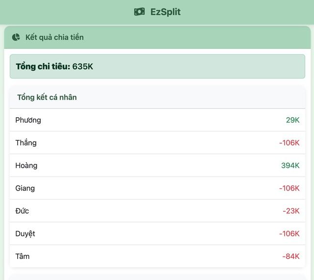 Kết quả chia tiền sẽ hiển thị phần tổng kết cá nhân, cho biết ai đã chi bao nhiêu tiền