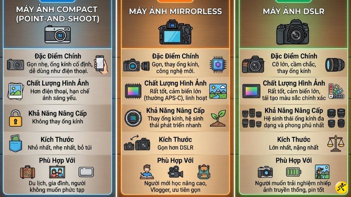 Hiện nay, thị trường máy ảnh chủ yếu gồm 3 dòng phổ biến: Compact (máy ảnh du lịch), Mirrorless (máy ảnh không gương lật) và DSLR. Mỗi dòng sở hữu ưu điểm và hạn chế riêng, đáp ứng những nhu cầu sử dụng khác nhau.