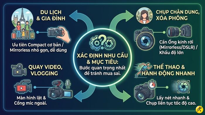 Đây là bước then chốt giúp bạn tránh mua nhầm máy ảnh không phù hợp. Trước tiên, hãy tự đặt câu hỏi: bạn sẽ sử dụng máy ảnh chủ yếu cho mục đích nào?